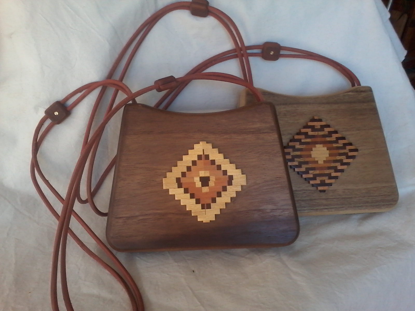 Bolsos en madera de kiri y timbò,con taracea en el frente,las manijas son de correas de cuero con pasadores,miden 23 x 17 cm